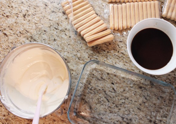Next, prepare a large baking dish, I use a glass one, as that is pretty iconic, (my dish is about 10×14 inches). It is good to create a station with your cookies, coffee, and cream. You will need to dunk your cookies into the cooled espresso, for about 2 seconds or so, and lay them in the dish, close to the next cookies until you have filled a row of espresso soaked cookies. This is a tricky part as you do not want to over or under soak your cookies. I tend to test a cookie by dunking it for 2 seconds and then biting it to see how much espresso it retained (keep in mind, it will get soft with the cream on top over night). If it is to your liking you can then layer about 1/2 the cream on top, smooth it out, and repeat. I usually do 2 layers, and this is the perfect amount to finish the box of cookies, the cream, and most of the espresso (but not all, as I generally make too much).