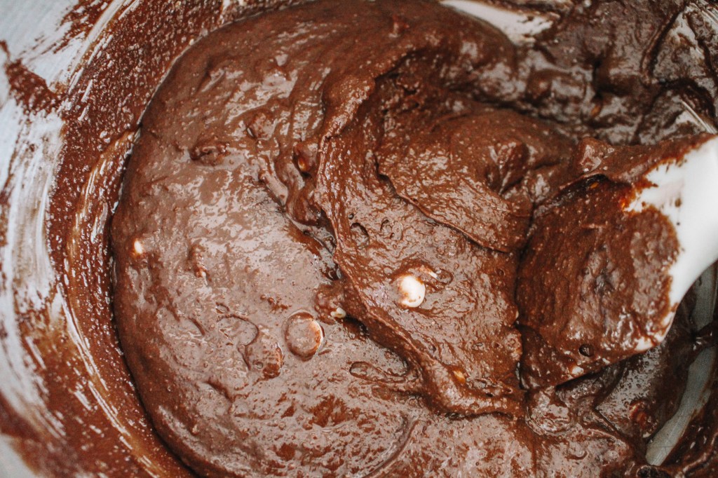 Finally add the white chocolate chips (if you are using) and mix in with a spatula so that you do not over-beat this batter. You can also scrape down the bowl with a spatula at this point.