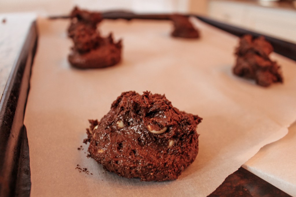 The best part about these cookies is that they are ready to bake as soon as you make them, so prepare a baking sheet pan with parchment paper, and scoop the batter out. I like large cookies and so this batter bakes about 10 to 12 large brownie cookies. I use a 1/4 cup measuring cup, with a mini spatula to get the batter out and onto the parchment paper.