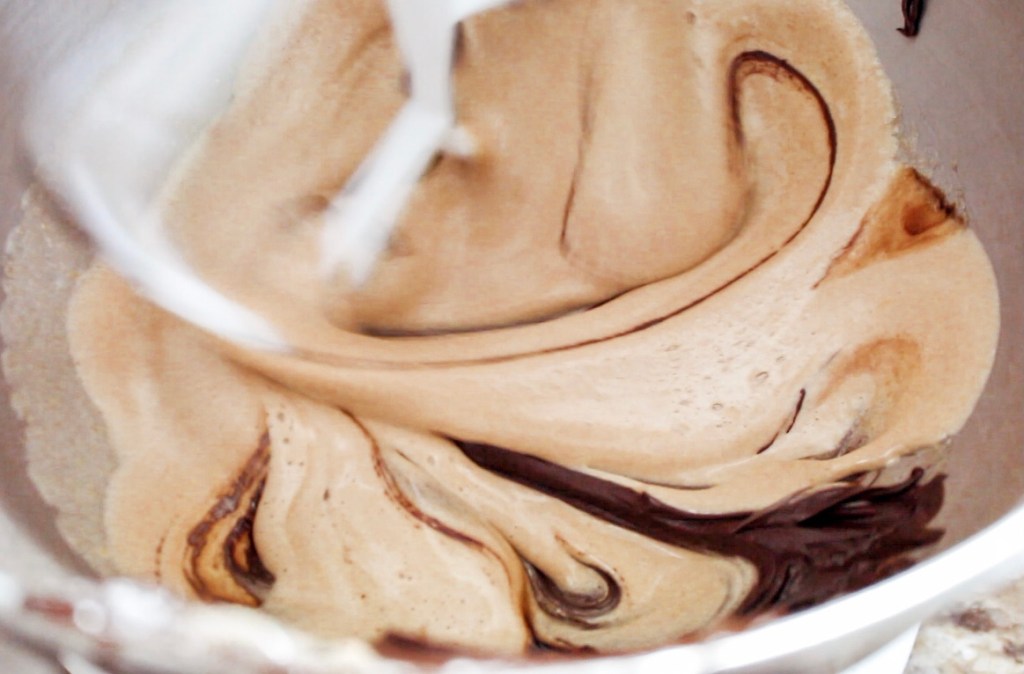 Then, add the melted, yet slightly cooled chocolate and butter, as well as the liquid coffee mix, and whip for 1 minute on a medium speed until incorporated.