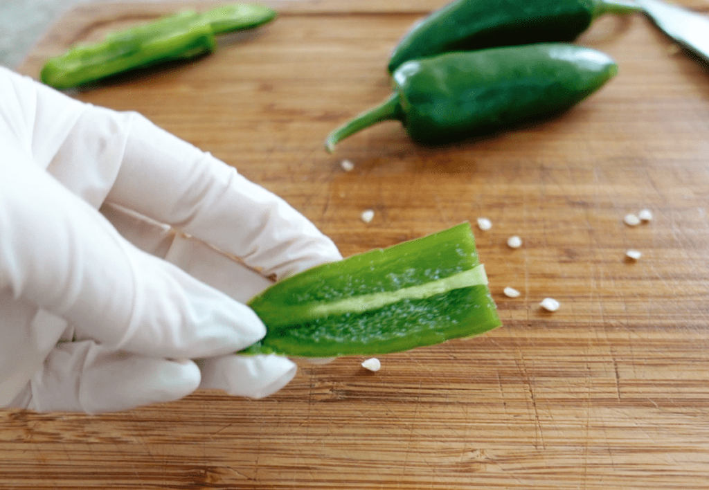 Put on kitchen gloves and slice the jalapeños. Always be sure to use gloves or your hands will burn after (I learned this the hard way)! I slice them in half, remove the seeds, then cut into long strips and then dice them. They should be the same size as the onion, so nice tiny pieces. If you find 3 jalapeños to be too spicy, you can add only 1 or 2, or omit this altogether, but I find they add a nice little hint of spice.