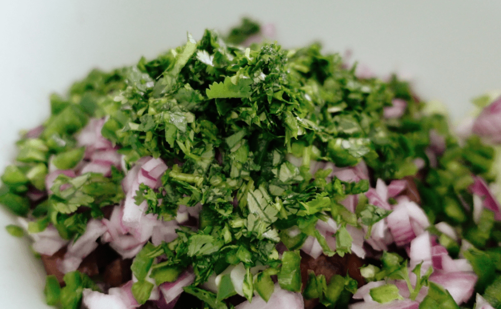 Take one bunch of cilantros, and remove the stems and then finely chop it. I like to really mince this herb up. You will use about a large handful or as much or as little as you like. Many people either LOVE or hate cilantro. I love it, as I feel it adds such a lovely freshness to this recipe, but feel free to replace it with a bit of parsley, or omit it altogether.