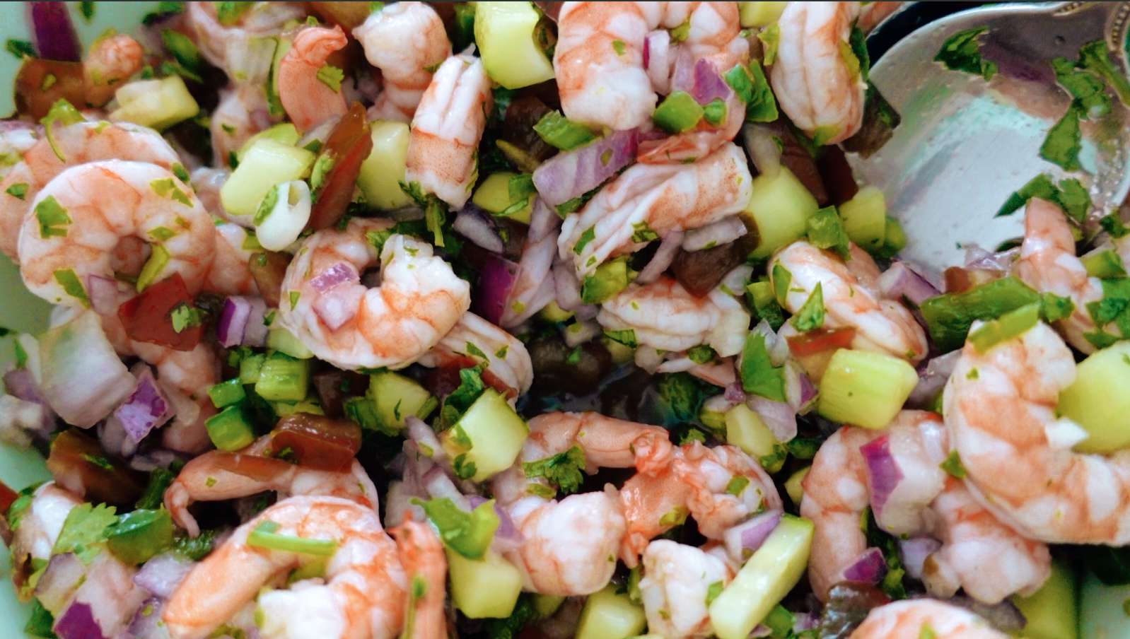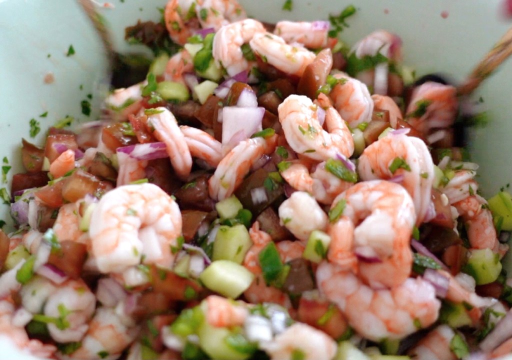 Give everything a mix to incorporate all of the jucies, vegetables, seasoning, and of course shrimp. This looks like a gorgeous dish at this point, and since the shrimp is cooked you can even serve it right away. However, I recommend a few hours in the fridge, even 24 hours is fine, so you can make this the night before. I like the shrimp to really marinate in the juices, so about 4 hours covered in the fridge is a good time.