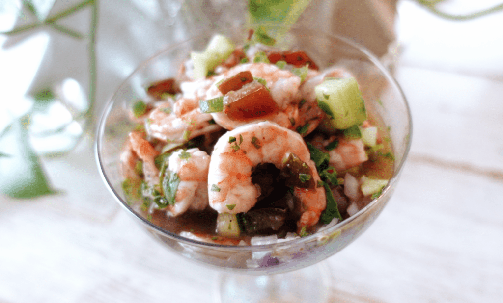 How easy was that?! You now have a lovely Shrimp Ceviche to eat and enjoy. You can serve this with crackers or tortilla chips, or simply eat as is. It is the perfect appetizer, or even accompanied with a main dish. However you eat this, you will love this! It never lasts 24 hours in my house, so I am so happy to share this delicious recipe with all of you! It is so fresh, and packed full of flavour, you’ll forget it’s healthy too!