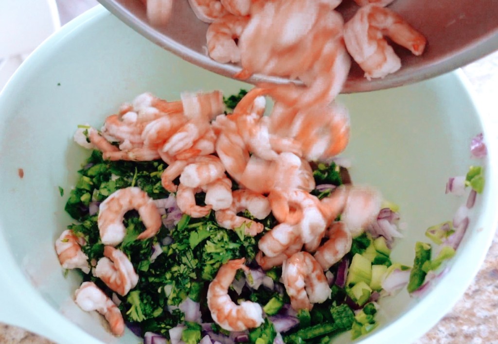 I use raw, frozen, already peeled and deveined shrimps. Since we are cooking the shrimps in this recipe, you can buy already cooked shrimp, and defrost it yourself. If you have a really good quality shrimp, feel free to use the raw shrimps and marinate for 48 hours. Since we do not always have access to very fresh shrimp, I like to use the frozen shrimp and defrost, and cook the shrimp at the same time, so here is what I do: